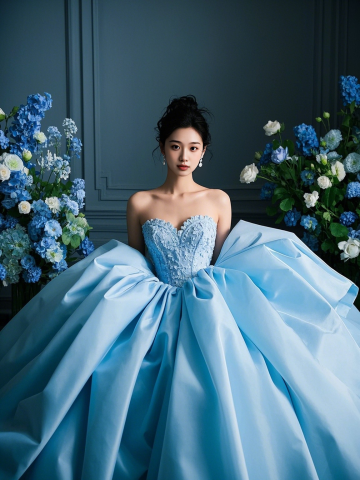 梦幻蓝色礼裙,轻拟物风设计,优雅浪漫,宛如欧洲宫廷艺术中的唯美女神。