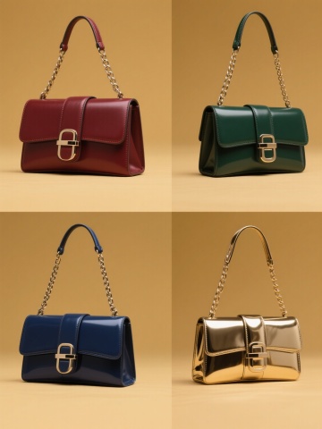 四个完全不同风格、不同造型的手提袋系列素材集合,规整排布,每个手提袋均保持手提袋的基本功能和形态,采用纯色背景,第一个是具有未来感的透明PVC材质手提袋,整体为亮蓝色,带有银色金属链条手提带和几何切割边缘;第二个是复古牛皮纸手提袋,整体为棕黄色,带有粗麻绳手提带和做旧纹理,袋身有简约的黑色线条手绘图案;第三个是奢华丝绒材质手提袋,整体为酒红色,带有金色刺绣手提带和精致的珍珠装饰;第四个是现代简约帆布材质手提袋,整体为草绿色,带有同色系棉质手提带和白色简约字母印花,所有手提袋均为高质量3D渲染,光影效果自然,具有清晰的材质质感,整体画面干净整洁,信息传达高效,适合作为时尚产品的宣传素材。