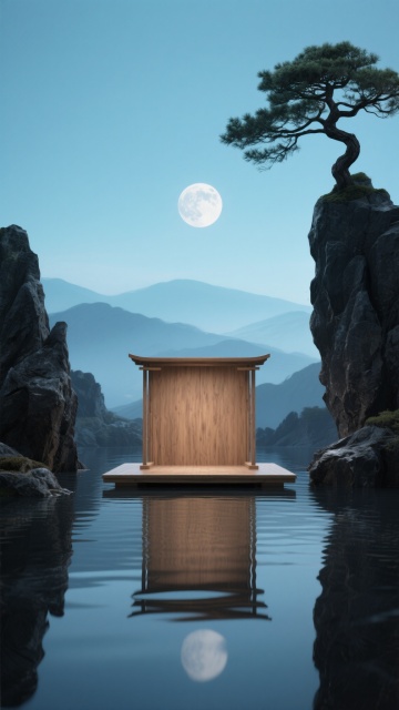 竖构图,宋代水墨风格工笔重彩,深秋的江南古刹后院,画面中央是半月形的青石板浅滩,倒映着斜斜掠过的丹枫枝桠,形成破碎却灵动的对称。前景是青苔斑驳的青灰色石阶,不规则的积水洼中沉着几片朱砂色枫叶,边缘泛着冷银色的反光。背景是几株千年银杏,金黄扇形叶片在黛色瓦檐间簌簌飘落,晨雾带着淡青色从飞檐斗拱间漫出,与初升朝阳的暖金交织成缥缈的光幕。左侧一株老梅虬曲的枝干斜插入画,墨色枝干上已缀着几点含苞待放的胭脂红。整体色调以靛青、赭石、泥金为主,笔触既有工笔的细腻勾勒,又有水墨的氤氲晕染,宣纸纹理间透出古旧的绢黄色,垂直的银杏树干与水平的浅滩倒影形成禅意的几何对比,营造出"空山新雨后,天气晚来秋"的空灵意境。