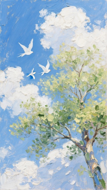 印象派风格天空,柔和的浅蓝色渐变背景,蓬松的白色云朵以松散的笔触和微妙的色彩变化呈现,阳光透过云层洒下温暖的光晕,整体画面营造出宁静而梦幻的氛围,具有莫奈作品中典型的光影流动感和色彩交融效果,笔触自由奔放,色彩明亮清新,给人以轻松愉悦的视觉感受。