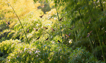 白色背景上由多只飞鸟组成的简约线条图案,飞鸟以不同姿态和大小分布,线条流畅轻盈,整体呈现出简洁、空灵的设计感,无任何文字和装饰元素。