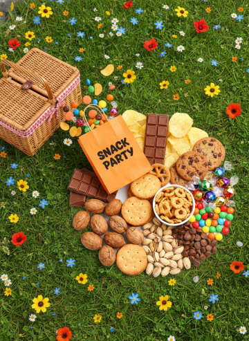 深色背景下,木桌上摆满了种类丰富的美味零食,包括金黄酥脆的薯片、各种形状的饼干、奶酪棒、巧克力豆、坚果、水果干、小番茄、瓶装饮料和调味酱等,所有零食色彩鲜艳、质感真实,光线从上方柔和照射,突出食物的诱人光泽和立体感,营造出丰盛、美味、令人食欲大开的氛围。