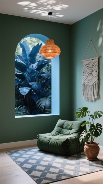 低角度仰拍,极简主义客厅被深邃的靛蓝色黄昏笼罩,磨砂玻璃移门过滤出靛青与紫罗兰交织的暮色,原L形沙发现为深炭灰色丝绒材质,两个不规则几何黄铜边靠垫在暗光中泛着冷金属光泽,相连的茶几变为悬浮式黑色大理石台面,下方垂挂着三盏微型玻璃钟乳石吊灯。浅灰色地毯升级为带有细微银色几何图案的羊毛材质,人字形木地板在阴影中呈现深棕与乌木色的渐变。沙发背景墙变为哑光黑色,中央悬挂着一幅悬浮式LED光影装置,金色线条随时间缓慢流动变幻形态。右侧角落的绿植现为一株大型琴叶榕,栽于六边形哑光黑水泥花盆中,叶片边缘在暮色中泛着蓝绿色荧光。天花板中央是一个直径两米的圆形智能调光装置,此刻正投射出类似月食的渐变光晕,空间整体呈现出一种冷静克制的未来感,却依然保留着家的温度与静谧。