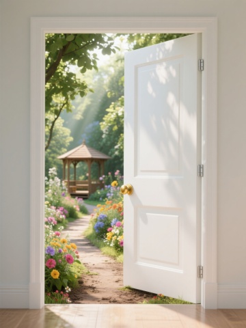 远景俯拍,在一座被永恒暮色笼罩的古老森林深处,一棵需要十人手牵手才能环抱的巨型古树下,树干中央裂开一道垂直的天然门户,深棕色的木质纹理如同凝固的河流般蜿蜒而上,门楣处悬挂着三盏用萤火虫编织的灯笼,散发着幽幽的青绿色光芒。门上镶嵌着两个不规则形状的琥珀色树脂窗,里面封存着百年前的蕨类植物标本。门把手是一截自然弯曲的老藤,末端结着一颗会随触碰变色的苔藓球。门的两侧是覆盖着荧光苔藓的巨石,地面铺满厚厚的、散发着泥土芬芳的落叶层,几株发光蘑菇在门旁静静生长。空气中弥漫着雨后森林的湿润气息和淡淡的松针香,画面构图采用三分法,古树占据中央垂直轴线,整体色调是神秘的靛蓝与苔藓绿交织,只有门周围散发着温暖的光晕。