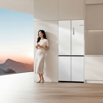 一台银色海尔双门冰箱,金属拉丝质感,表面光滑有反光,位于画面中央偏右位置,保持原有的高度、比例和品牌标识。整体采用写实主义风格,光线明亮柔和,主色调为银色、白色和原木色,光影效果自然,有清晰的明暗过渡和柔和阴影。冰箱被放置在一个充满自然气息的阳台环境中,左侧是开阔的落地玻璃窗,窗外可见碧海蓝天和白色沙滩,右侧摆放着一个白色的藤编小茶几,上面放着一盆绿色多肉植物和一本翻开的杂志,阳台地面铺设浅色木质地板,墙角处有一盆垂吊的常春藤,阳光透过窗户洒在冰箱和地面上,营造出清新、舒适、放松的氛围,整体画面干净整洁,信息传达简洁明了,符合现代家居产品展示的设计感。