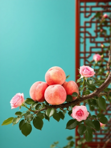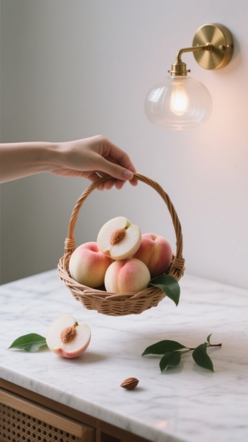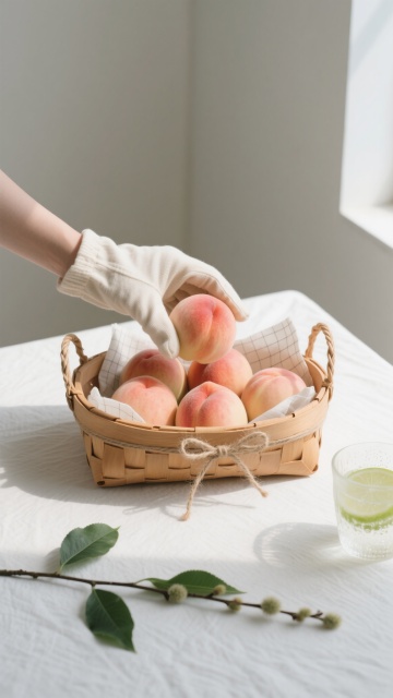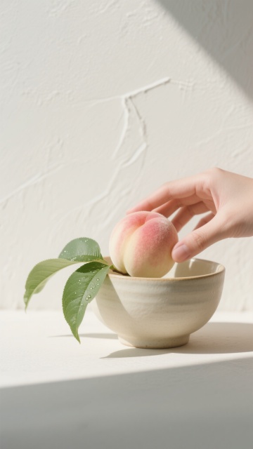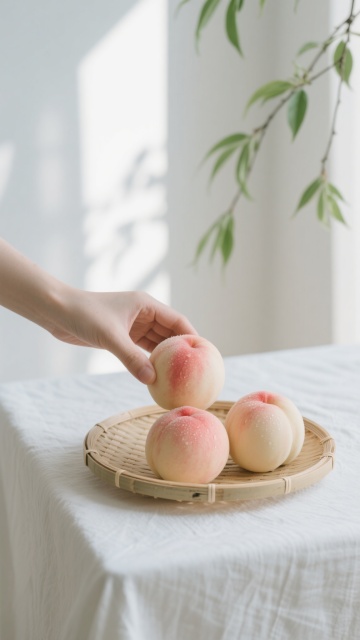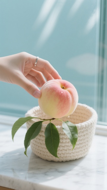 俯拍构图,一只纤细的手正从纯白色骨瓷盘中央轻轻拿起一颗饱满的水蜜桃,盘子边缘整齐排列着五颗大小均匀的桃子,果皮呈现出渐变的粉白与胭脂红,顶部果蒂带着嫩绿的绒毛,几滴水珠在阳光下折射出微小彩虹。背景是极简的浅灰色亚麻桌布,左上角斜插着三枝带着嫩芽的桃木枝,右下角散落着三张半透明的米白色烘焙油纸。光线从左上方45度角倾泻而下,形成柔和的三角形光斑,在桃子表面留下精致的明暗交界线,色调以象牙白为基底,点缀着蜜桃粉与嫩芽绿,整体画面散发着干净、优雅的初夏气息。
