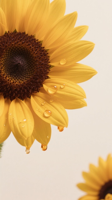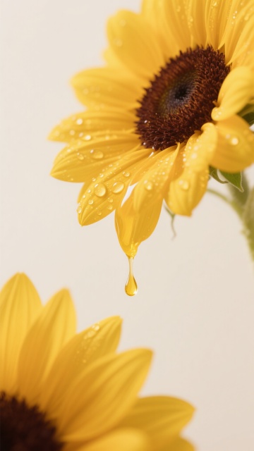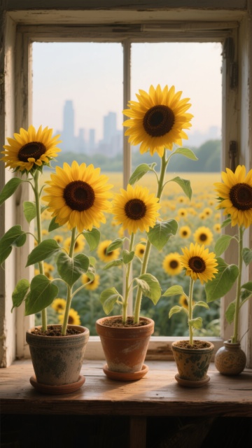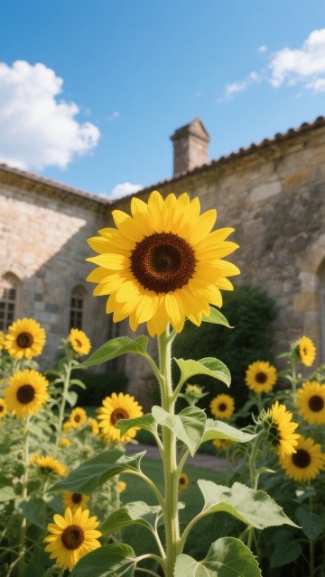 一片生机盎然的向日葵花田,前景中几朵盛开的向日葵占据主要视觉位置,金黄色的花瓣层层叠叠,中心是深棕色的花盘,布满细密的葵花籽,花茎挺拔,翠绿的叶片舒展,边缘带有自然的锯齿。向日葵们迎着阳光,花盘微微上扬。背景是晴朗的蓝天,漂浮着几朵蓬松的白云,阳光明媚,光线充足,在花瓣和叶片上形成明亮的高光和清晰的阴影,整体画面色彩鲜艳明快,充满夏日的活力与温暖。