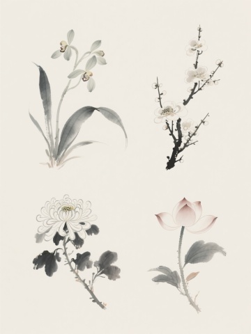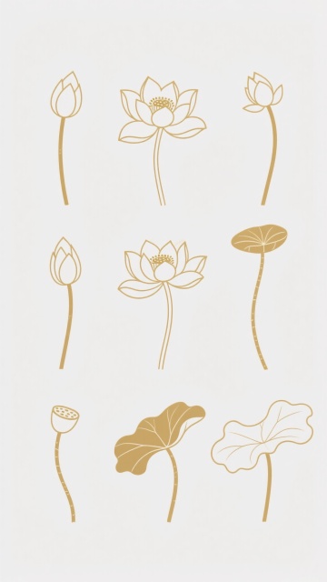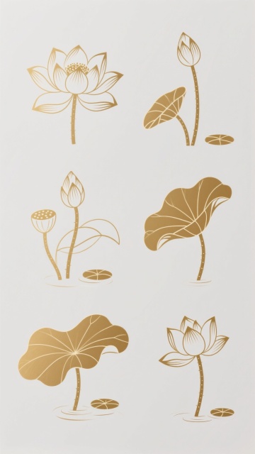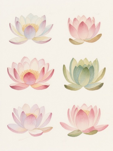 中国传统水墨风格,淡雅浅色背景,六朵不同样式的莲花,上下两行对齐排列,粉色花瓣,绿色荷叶,水面涟漪,墨色晕染效果,留白意境,清新自然,线条流畅,笔触细腻,水彩质感,传统工笔画风格,对称构图,无文字无logo。