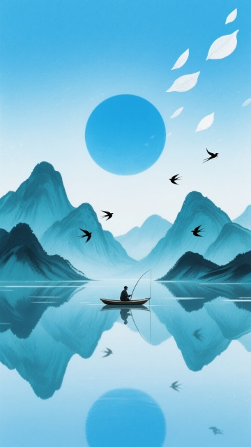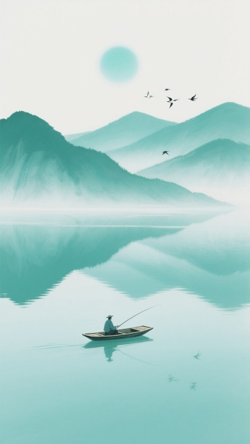 新中式水墨风格山水画卷,以柔和的青绿色调为主,远处层叠的山峦在薄雾中若隐若现,近处平静的湖面上一叶扁舟静静漂浮,岸边点缀着几株水墨风格的树木,天空中一群飞鸟自由翱翔,整体画面营造出宁静悠远的意境,构图采用传统山水画的高远视角,留白恰到好处,展现出空灵淡雅的东方美学韵味。