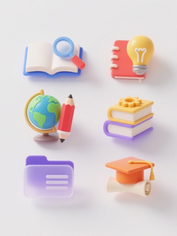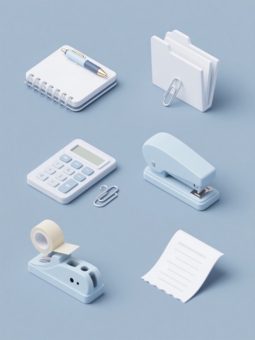 采用现代简约2.5D风格,以纯色背景为基调,画面整体呈现柔和的渐变光影效果,物体边缘有轻微的模糊高光处理,营造出轻盈通透的视觉氛围。六个完全不同的工作元素规整排布,每个元素均保持统一的设计语言:主体物体造型简洁圆润,色彩以低饱和度的蓝紫色系为主,搭配少量鲜亮的绿色作为点缀,底部带有半透明的浅色阴影增强立体感。元素包括:打开的笔记本上放置着一支绿色钢笔、蓝色文件夹上别着一枚圆形回形针、白色咖啡杯旁叠放着三张便签纸、灰色打印机正在吐出一张带有绿色对勾的纸张、银色笔记本电脑屏幕显示着文档界面、橙色日历上标记着一个绿色的重要日期。所有元素布局均衡,间距一致,共同构成一套风格统一、视觉协调的工作主题系列素材集合。