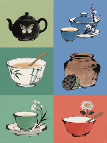 中国传统水墨风格的荷花主题插画,采用淡雅的水彩晕染技法,以浅米色为背景,画面中上下两行对齐排列六个不同配色、不同样式、不同材质的莲花造型,每个莲花都具有透明感的花瓣层次和细腻的叶脉纹理,色彩从粉红渐变到鹅黄、从淡紫过渡到青绿、从藕荷色晕染至雪白,样式包含含苞待放的花骨朵、半开的清雅姿态、完全绽放的饱满形态,材质分别呈现宣纸水墨的氤氲感、瓷质的温润光泽、丝绸的柔滑质感、玉石的通透莹润、琉璃的璀璨光泽和青铜的古朴肌理,整体构图遵循东方美学的留白艺术,线条流畅自然,色彩和谐统一,展现出宁静致远的禅意氛围。