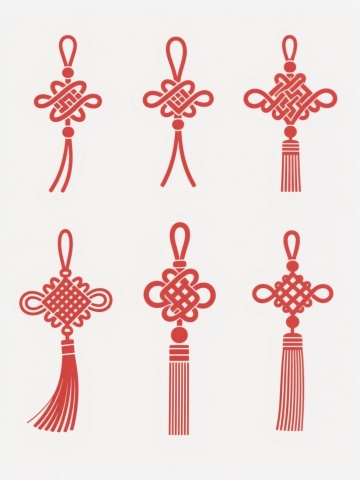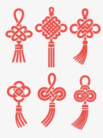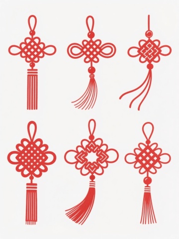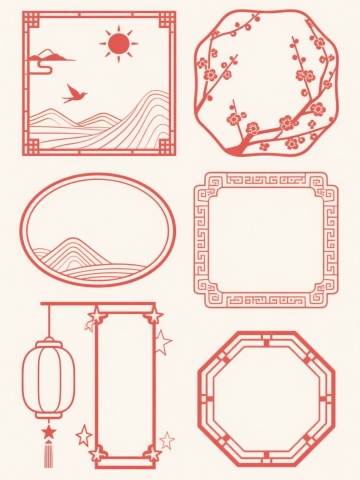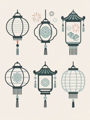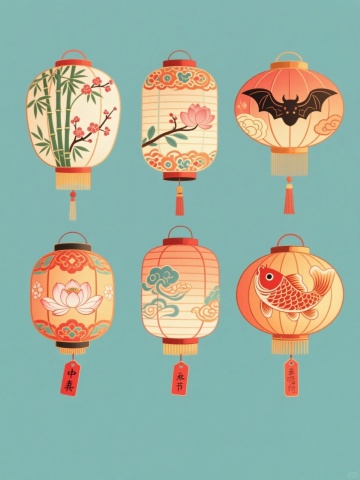 卡通插画风,一组6个红色中国传统灯笼的集合,每个灯笼造型各异,包括圆形、椭圆形、方形、多层叠挂等样式,均以简洁流畅的金色线条勾勒轮廓,内部为纯红色填充,部分灯笼装饰有流苏、中国结、梅花图案等传统元素,所有灯笼在纯白色背景上均匀排列,呈现出鲜明的色彩对比和清晰的视觉层次,整体风格喜庆、简洁、具有浓厚的节日氛围和传统韵味。