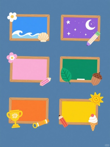 一套6个同风格不同元素的卡通风格插画素材集合,每个素材均为规整排布,包含木质边框的矩形板、角落装饰花朵和底部粉笔,整体画面为纯色背景,采用简洁线条、平面色块、无阴影的扁平设计风格。1. 蓝色调海洋主题:蓝色矩形板,角落装饰白色浪花,底部放置贝壳形状粉笔;2. 粉色调甜品主题:粉色矩形板,角落装饰奶油花,底部放置糖果形状粉笔;3. 绿色调自然主题:绿色矩形板,角落装饰树叶,底部放置橡果形状粉笔;4. 紫色调星空主题:紫色矩形板,角落装饰星星,底部放置月亮形状粉笔;5. 橙色调运动主题:橙色矩形板,角落装饰奖杯,底部放置口哨形状粉笔;6. 黄色调阳光主题:黄色矩形板,角落装饰太阳,底部放置冰淇淋形状粉笔。所有元素保持相同的布局结构和视觉层级,整体呈现统一风格下的色彩与主题多样性。