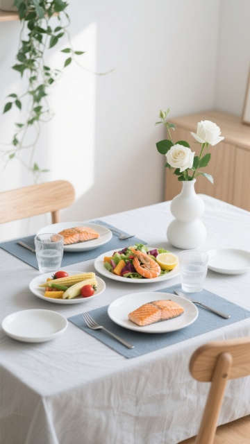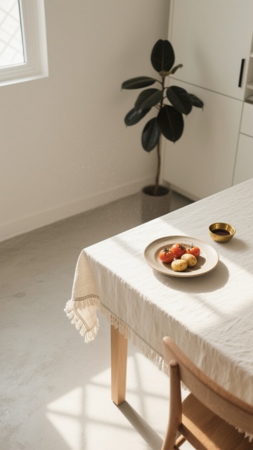简约温馨的餐桌场景,白色编织纹理桌布带有流苏边缘,桌上摆放一瓶香槟、两个高脚杯、一个白色餐盘及刀叉,背景墙面有浅色木质搁板,上面放置面包、果酱罐和收纳盒,整体采用柔和自然光,营造明亮舒适的居家氛围,不同样式风格的餐桌背景设计,配色清新自然,具有良好的视觉层次感和生活气息,适合作为温馨家居或餐饮相关的背景展示。