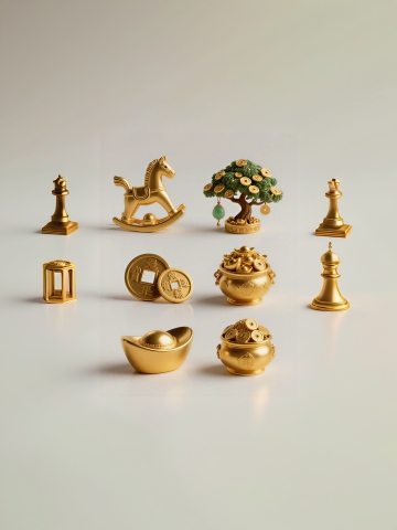 3D渲染风格的系列素材集合,整体采用高光泽度的金黄色金属质感,表面有细腻的光影反射和渐变效果,光源从左上方照射形成明显的高光和阴影层次,纯色背景,六个规整排布的不同传统财富元素:左侧上方为一个开口朝上的金元宝内放置金珠,右侧上方是一串由五颗圆形金珠组成的金项链,左侧中间为一个方形底座的金印,右侧中间是一枚刻有古钱币图案的圆形金牌,左侧下方是一个三层叠放的金元宝塔,右侧下方为一个带有祥云纹路的金如意,所有元素保持统一的3D立体造型、金属光泽和光影处理,呈2行3列规整排列,构图对称平衡,传达出富贵、吉祥的氛围。