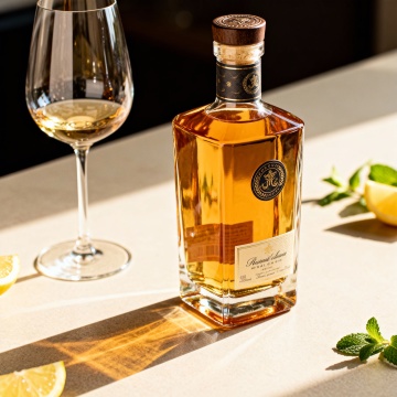 在豪华游艇的甲板上,黄昏时分,琥珀色的威士忌酒液盛在带有菱形切割纹路的水晶杯中,杯内漂浮着大块透明冰块,旁边是一瓶带有黑色瓶盖的方形玻璃酒瓶,酒瓶和酒杯置于深色木质甲板上,散落着几块备用冰块,背景是渐变的橙黄色晚霞与深蓝色海面,温暖的侧逆光从海面方向照射过来,在酒液和冰块上形成璀璨的高光和金色反光,营造出奢华、惬意而又带有一丝神秘的氛围,整体采用写实主义风格,光影对比强烈,细节质感丰富,色彩以琥珀色、深蓝色和金色为主,构图采用经典的产品静物布局,突出威士忌的醇厚与优雅。