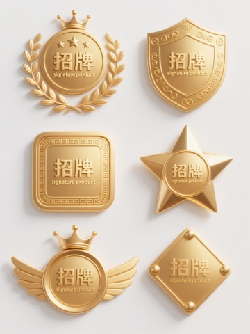 一组6个金色徽章系列素材,每个徽章均保持核心元素:中文“招牌”文字、英文“signature product”、顶部小皇冠,采用相同的金色渐变金属质感、高光阴影表现和精致细节刻画,背景为纯色白色。6个徽章造型完全不同:1. 圆形徽章,外围环绕月桂枝叶和顶部五颗五角星;2. 盾形徽章,边缘有卷草花纹装饰;3. 方形徽章,四角为圆角处理,边框有回纹图案;4. 星形徽章,五角星形轮廓,内部圆形区域放置文字;5. 椭圆形徽章,两侧有对称的翅膀元素;6. 菱形徽章,每个角有小圆形装饰。所有徽章规整排布,保持统一的3D立体风格、金色调色彩和谐、光影效果和高品质质感,形成风格统一又造型多样的系列设计。