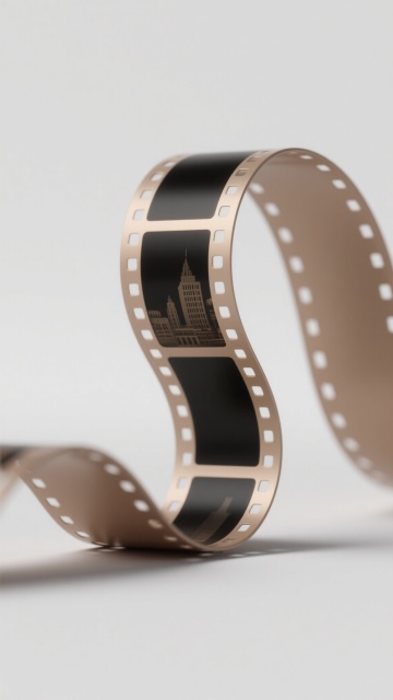 3D渲染风格的电影主题背景,主色调为温暖的棕黄色与金色,柔和的侧上方光源投射出清晰而富有层次感的阴影,高光在金属表面形成细腻的反光。画面中心偏左位置放置一个复古电影胶片卷轴,金属轮盘呈现出精致的齿轮纹理和哑光金属质感,卷轴上缠绕着深棕色的胶片。一条黑色的电影胶片带从卷轴中延伸出来,向右下方自然弯曲,胶片边缘的孔洞和方形胶片格细节清晰可见,胶片带在浅色背景上投下带有胶片格阴影的光影图案。整体构图采用简洁的静物摆拍形式,背景为平滑的浅棕色平面,营造出怀旧、专业且略带神秘感的电影氛围,突出电影工业的经典元素与艺术质感。