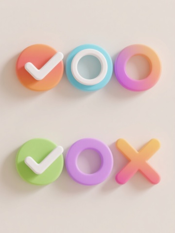 六个「对错」造型图标,分为上下两行对齐排列,每行三个图标,浅色背景。三个对勾图标分别采用不同配色、样式和材质:第一个为绿色圆形轮廓搭配绿色填充的扁平风格对勾,线条流畅圆润;第二个为蓝色渐变金属质感对勾,边缘有高光和阴影,呈现出立体光泽效果;第三个为橙色手绘风格对勾,线条带有细微的笔触纹理,色彩饱满温暖。三个叉号图标同样各具特色:第一个是红色圆形轮廓搭配红色填充的扁平风格叉号,造型简洁明了;第二个是紫色磨砂玻璃材质叉号,半透明质感,边缘柔和;第三个是黄色木质纹理叉号,表面有自然的木纹肌理,呈现出质朴的材质感。所有图标保持统一的圆形外框比例,整体视觉风格协调,色彩鲜明且对比清晰,信息传达直观高效,符合现代简约的设计美学。