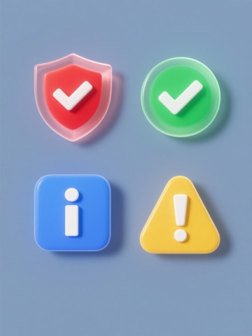 一组四个不同颜色的3D立体圆形按钮图标,每个按钮具有光滑的塑料质感和明亮的渐变色彩,分别为红色、蓝色、绿色和紫色,按钮表面有强烈的高光反射和细微的阴影效果,每个按钮中央有一个白色的简约符号,分别是对勾、叉号、感叹号和问号,所有按钮整齐排列在纯白色背景上,保持一致的尺寸和圆润的边缘设计,整体风格统一且具有现代感。