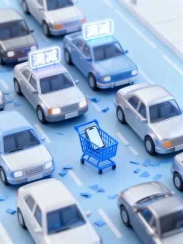 科技感与未来感交织的3D微缩场景,卡通风格汽车穿梭于霓虹灯风道路,购物车中手机象征数字消费,塑料质感强化视觉冲击,满减标识点亮节日促销氛围。