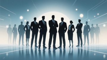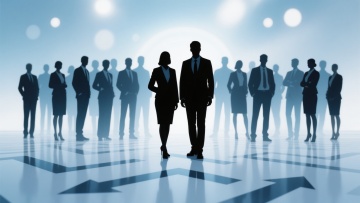 一群身着职业装的商务人士剪影,前方有一对男女领导者形象突出,后方众人排列成团队阵型,整体呈现半透明渐变效果,背景为明亮的浅蓝色调,带有光晕和光斑效果,地面有反光质感,营造出专业、团结且充满活力的商务团队氛围,具有现代科技感和简洁的设计风格。
