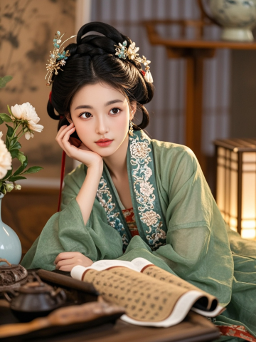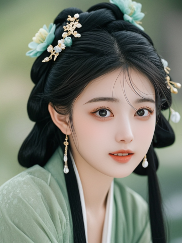 一名身穿绿色系汉服的女生,中式发饰,皮肤纹理清晰,高清商业摄影,半身照,人物特征保持