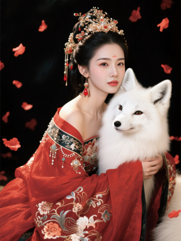 古典中式风格,唯美的工笔风刺绣服饰,拟人化的白狐相伴,超现实主义的花瓣飘落。