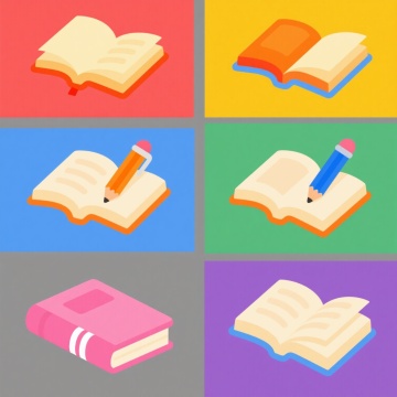一套由6个完全不同造型的卡通风格学习元素系列素材组成的规整排布集合,每个元素均保持相同的核心内容:一本翻开的橙色封面书本,书页为米黄色,书口有红色细节,书本下方是一本粉色封面的闭合书籍,书脊有两条白色条纹,一支带有橙色笔帽和蓝色笔身的铅笔斜靠在翻开的书页上;所有元素均采用相同的扁平化卡通风格,具有圆润的线条、简洁的造型、均匀的色块填充和轻微的渐变过渡以增强立体感,高光和阴影处理简洁明快,营造出轻松活泼的氛围;每个元素分别置于不同颜色的纯色背景上(如红色、黄色、绿色、蓝色、紫色、灰色),整体画面色彩根据不同背景色进行协调变换,保持元素内容不变,整体排布规整有序,视觉上形成统一且富有变化的系列感。