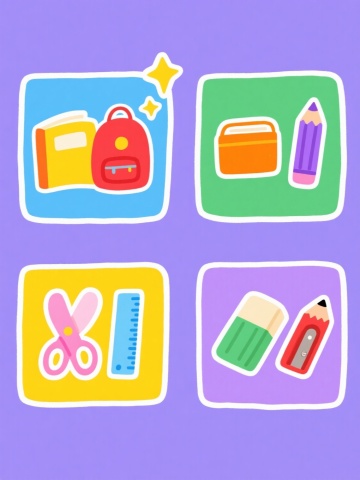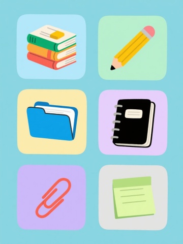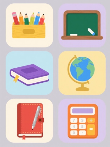 一套6个不同内容的教育主题矢量素材集合,每个素材均为规整排布的物品组合,保持统一的简约矢量风格和纯色背景。第一个素材:木质边框绿色黑板,右下角放置蓝色板擦和白色粉笔;第二个素材:棕色皮质笔记本,翻开的页面上放着一支银色钢笔和黄色便利贴;第三个素材:透明玻璃水杯,旁边是橙色铅笔盒,盒内露出红色铅笔和绿色橡皮;第四个素材:蓝色硬壳文件夹,上面压着银色回形针和白色便签纸;第五个素材:米色帆布书包,拉链部分打开,露出紫色笔记本和粉色文具盒;第六个素材:白色陶瓷笔筒,内插黑色马克笔、棕色蜡笔和绿色水彩笔。所有元素边缘平滑,色彩明快且区分度高,背景为不同纯色,整体布局对称平衡,适合教育相关设计使用。