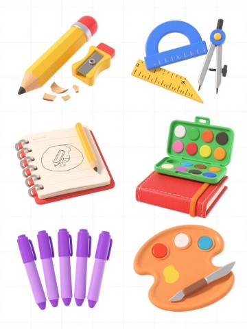 一组6个完全不同的绘画工具元素集合,保持统一的卡通手绘风格,每个元素独立置于纯白色背景上,采用规整的网格排布。元素包括:1. 黄色木质铅笔与卷笔刀组合,铅笔带有红色橡皮擦头,卷笔刀旁散落几小段木屑;2. 蓝色金属圆规与黄色量角器叠放,圆规针尖锐利,量角器刻度清晰;3. 绿色塑料水彩颜料盒,盒盖打开露出12格不同颜色的颜料,附带一支平头水彩笔;4. 红色皮革材质素描本,翻开的页面上有简单的线条速写,本子边缘有金属螺旋装订;5. 紫色马克笔套装,5支不同粗细的马克笔并排摆放,笔帽颜色与笔身一致;6. 橙色陶瓷调色盘,盘内有5个颜料格,其中三格装有不同颜色的油画颜料,调色刀斜放在盘边。所有元素均采用平滑的边缘处理,明亮饱和的色彩,简洁的线条勾勒,以及轻微的立体阴影效果,整体呈现出活泼可爱的视觉风格。