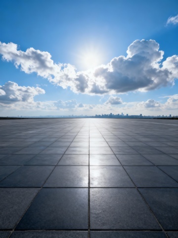 一张写实摄影风格的建筑场景照片,采用低角度仰拍构图,画面下方是具有自然石材纹理、接缝清晰的灰色调地面,地面向远处延伸汇聚于地平线;上方是广阔的天空,由下至上呈现从浅蓝到深蓝的渐变,点缀着几缕轻薄的白色云彩,整体光影柔和,光线均匀洒落在地面形成细腻的反光,营造出开阔、宁静、现代的氛围。