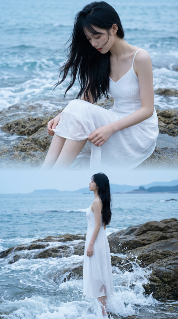 古典中式美人,红袍金绣,海边静谧,国潮风韵,水墨意境。