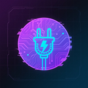 一个具有未来主义赛博朋克风格的圆形图标,中心是尖锐的白色闪电符号,主体采用深紫色与亮蓝色的霓虹渐变填充,边缘有强烈的辉光效果和电路纹理环绕,整体呈现出科技感十足的半透明玻璃态材质,背景为黑色,带有细微的网格和数据流效果,图标具有明显的金属边框和立体感,光影对比强烈,闪电符号带有动态的电流脉冲视觉效果。