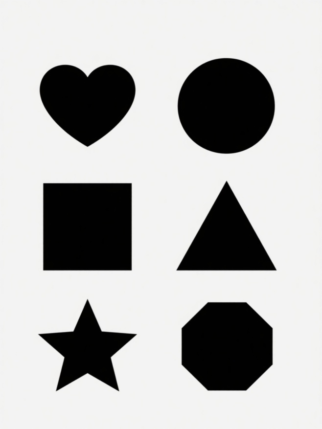 极简风格设计,纯白背景上整齐排列六个完全不同的黑色基础图形,分为上下两行每行三个呈网格状对齐,包括爱心(轮廓圆润饱满的对称心形)、标准圆形、正方形、正三角形,以及另外两个简洁几何形状(如五角星、六边形),所有图形均为纯黑色实心填充,边缘平滑无毛刺,构图均衡留白充足,整体呈现高度简洁的现代设计感。