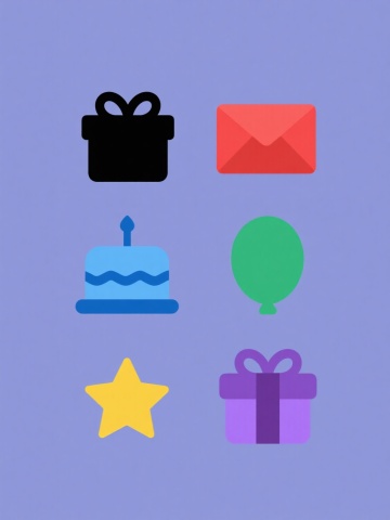 系列素材集合,规整排布在纯色背景上,保持简约现代的卡通插画风格,六个完全不同的节日庆典元素,每个元素都采用圆润的线条、鲜明的色彩对比和渐变过渡,具有轻微的立体感和光泽感,元素包括:1. 橙色和粉色条纹的派对帽,帽口飞出彩色卷曲彩带和圆点;2. 蓝色和紫色渐变的气球束,系着黄色丝带,气球上有白色高光;3. 红色和黄色的纸杯蛋糕,顶部有白色奶油和彩色糖屑;4. 绿色和蓝色的礼物盒,系着粉色蝴蝶结,盒盖微微打开,露出金色光芒;5. 紫色和粉色的生日蜡烛,蜡烛上有黄色火焰,周围有白色光点;6. 黄色和橙色的烟花,呈放射状绽放,有红色、蓝色和紫色的火花,所有元素大小一致,间距均匀,整体视觉风格统一。