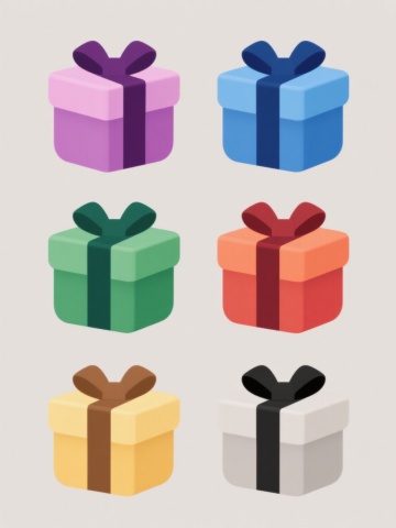 一组六个完全不同材质与造型的礼品盒系列素材集合,规整排布于纯色背景上。每个礼品盒均保留核心元素:盒体、大型蝴蝶结、丝带及星形装饰,但整体色彩与造型各异。第一个为磨砂玻璃材质的淡蓝色立方体礼盒,搭配银色金属蝴蝶结与透明丝带,表面有雪花暗纹;第二个是木质原色六边形礼盒,棕色皮质蝴蝶结系于侧面,麻绳丝带缠绕,缀有木质星星吊坠;第三个为亮面陶瓷材质的粉色圆柱形礼盒,顶部是同色系立体花朵造型蝴蝶结,金色细丝带垂下,星星为釉上彩装饰;第四个是黑色哑光金属材质的不规则多面体礼盒,搭配霓虹紫色光效蝴蝶结,金属链条丝带,星星为镂空发光设计;第五个是柔软毛绒材质的浅绿色心形礼盒,粉色绒球组成的蝴蝶结,缎面丝带,星星为刺绣贴布;第六个是透明亚克力材质的橙色几何拼接礼盒,镜面效果蝴蝶结,彩色渐变丝带,星星为内嵌LED灯的立体造型。所有礼盒均采用插画风格,光影柔和,细节丰富,整体保持统一的视觉平衡感与系列感。