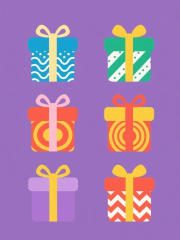 四个系列风格的礼盒元素集合,每个礼盒造型各异且色彩完全不同,均保持礼盒核心元素内容,规整排布在纯色背景上:第一个为3D立体渐变风格,大红色礼盒带金色蝴蝶结,从小号红色礼盒和金色星星、心形装饰中绽放;第二个为扁平化设计风格,蓝色礼盒配白色蝴蝶结,周围环绕着蓝色小礼盒和白色几何形状;第三个为手绘卡通风格,绿色礼盒系着黄色波点蝴蝶结,伴有绿色小礼盒和彩色五角星;第四个为极简线条风格,紫色礼盒搭配紫色细带蝴蝶结,四周分布着紫色线条勾勒的小礼盒和圆形装饰。