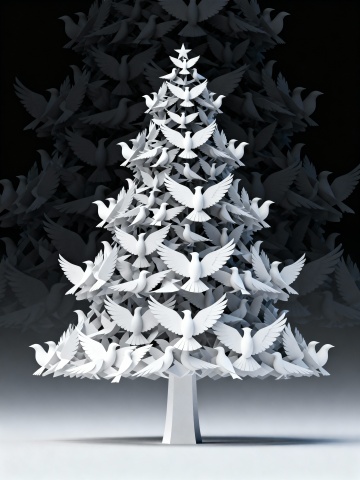 写实风格摄影,画面中多只洁白的飞鸟(鸽子)在茂密的绿树间自由飞翔,白色羽毛在阳光下泛着柔和光泽,红色的脚爪清晰可见,飞鸟姿态各异,有的展翅高飞,有的滑翔穿梭;背景是枝叶繁茂的树木,深绿色的叶片层次丰富,粗壮的树干纹理清晰,透过枝叶的缝隙可见明亮的蓝色天空,光影效果自然,阳光透过树叶形成斑驳的光影洒在飞鸟和枝叶上,整体氛围宁静而充满生机,构图饱满,飞鸟与绿树形成鲜明的色彩对比,展现出自然和谐的美好景象。
