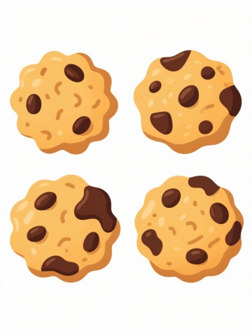 一套6种不同零食的插画集合,包括薯片、饼干、曲奇、面包、坚果和巧克力,采用清新明快的卡通手绘风格,色彩明亮柔和,边缘有轻微的轮廓线,每个零食包装和实物都有细致的纹理和阴影表现,整体画面简洁干净,所有元素规整地排列在纯色背景上,保持统一的视觉风格和比例大小。