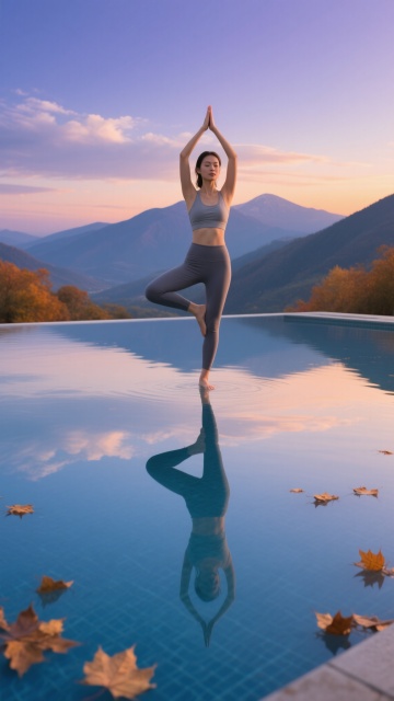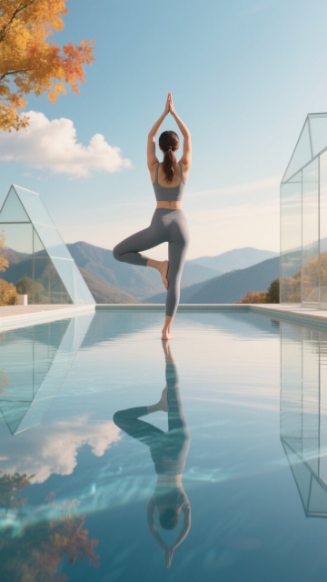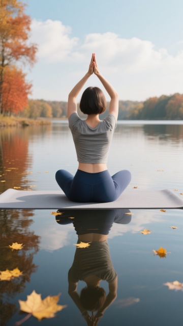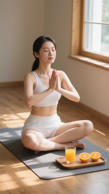写实风格,一位年轻亚洲女性穿着白色运动背心和短裤,双腿交叉盘坐在瑜伽垫上,双手合十举过头顶,闭眼冥想,神情宁静专注。柔和的自然光从画面左侧照射进来,在人物身上形成明亮的高光和清晰的阴影,木地板上投射出窗格的光影。背景改为宁静的森林空地,周围环绕着高大的树木,地面铺满绿色苔藓和散落的树叶,阳光透过树叶缝隙洒下斑驳光点,整体氛围清新自然、平和放松。