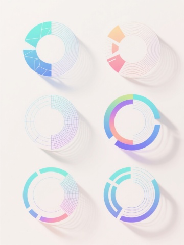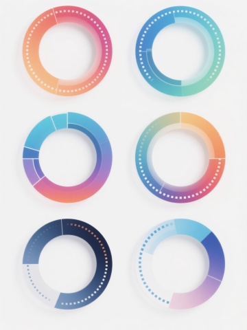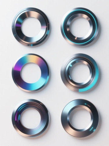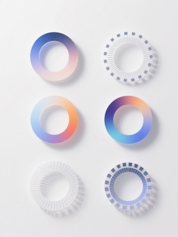 六个不同配色、不同样式、不同材质的圆圈元素,整齐排列在浅色背景上。每个圆圈都具有渐变色彩效果,带有多层环形边框设计,内部呈现柔和的光影过渡,整体风格为简洁现代的数字艺术设计,视觉层次清晰,色彩和谐统一。