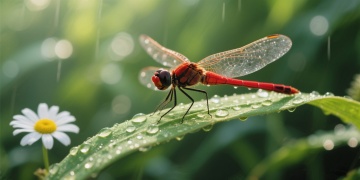 一只飞鸟正展翅悬停,头部黑色带白色斑纹,颈部和胸部呈红褐色,背部及翅膀羽毛为蓝灰色,腹部白色,尾羽细长黑色,尖喙叼住一枝挂满红色桑葚的枝条,枝条上有几片绿色叶片;背景为模糊的深绿色渐变,带有柔和的圆形光斑;写实摄影风格,光线从斜上方照射,鸟的翅膀羽毛边缘有金色高光,浆果表面有光泽,整体画面自然、生动、温馨,主体突出,细节清晰,景深控制得当,背景虚化突出主体。