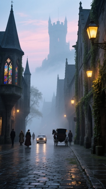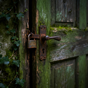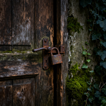 黎明微光中的古老修道院侧门,厚重的橡木双扉上嵌着六边形铅条玻璃,历经岁月的铜制门环与十字形锁具在晨露中泛着冷光,门楣上雕刻着模糊的拉丁文祷文。两侧是青苔斑驳的灰色石墙,顶部爬满干枯的常春藤,地面由不规则的青石板铺就并散落着昨夜的枯枝败叶,晨雾从门缝中渗出,将第一缕金色阳光折射成细碎的光斑,构图采用低角度仰拍强化门的庄严感,整体色调为青灰底色上点缀着暖金晨光,营造出神秘而肃穆的时空交界氛围。