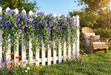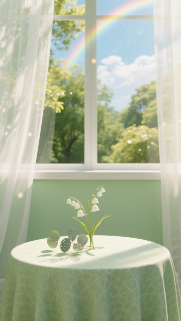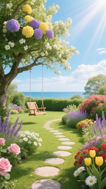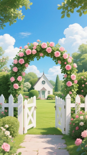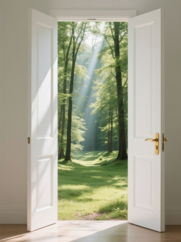 一扇白色的室内门,带有金色圆形门把手和银色铰链,门板上有一个矩形凹槽设计,门向右侧打开约45度角,门框为白色。门后不再是空白,而是通往一个充满生机的秘密花园场景:阳光透过茂密的树叶洒下斑驳光影,小径两旁盛开着五颜六色的花朵,远处有一座小巧的木质凉亭,空气中弥漫着清新的花香和泥土气息,整体画面明亮、通透,保持原有的高清晰度3D渲染质感和简洁干净的视觉风格。