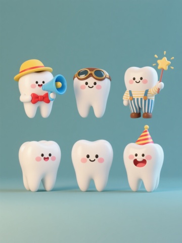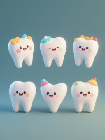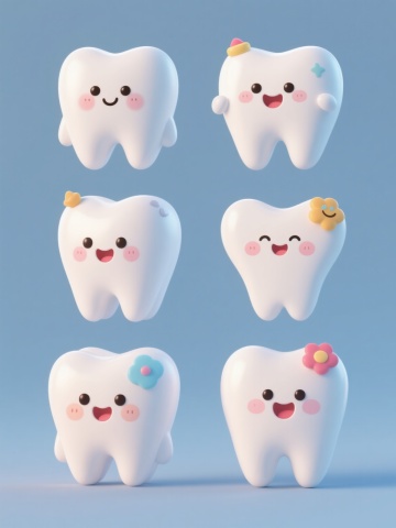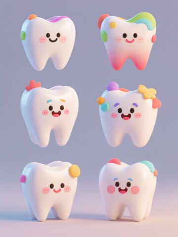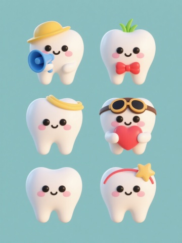 一组6个不同造型、不同形状、不同样式的卡通牙齿角色素材集合,每个牙齿都具有圆润饱满的3D立体造型和光滑细腻的质感,搭配丰富多彩的色彩方案,每个牙齿角色拥有独特的表情(如开心、惊讶、眨眼、微笑等)和姿态(如挥手、跳跃、比心、托腮等),部分牙齿可添加简单的可爱配饰(如小帽子、领结、眼镜等),所有牙齿角色整齐规排列在纯色背景上,保持明亮柔和的光影效果和清新活泼的整体氛围,画面色彩整体变换为鲜艳明快的多色调组合,每个牙齿角色拥有独特的主色调但整体保持和谐统一。