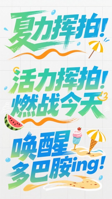 一组适用于电商场景的夏日主题创意艺术字体设计,保持原图中具有力量感的粗体书法笔触与现代无衬线字体相结合的设计风格,将主色调改为清爽明亮的渐变蓝绿色系(如薄荷绿、天空蓝、海水蓝)并搭配活力橙黄色作为点缀,整体色彩呈现夏日清凉感。字体保留原图中的立体光影效果、锐利边缘与笔画末端的动感飞白设计,融入夏日元素如:波浪线条、水滴、西瓜纹、冰淇淋、太阳伞、沙滩等图形作为字体装饰或背景纹理。排版采用整齐的网格布局,每行3个词组,文字内容替换为适合电商夏日促销的文案,如“夏日狂欢购”“冰爽特惠”“新品上市”“限时秒杀”“清凉一夏”“满减优惠”“夏日必备”“热卖爆款”“冰凉体验”等,确保文案简洁有力且符合电商信息传达效率,整体设计充满夏日活力与促销氛围,视觉层级清晰,字体与夏日元素融合自然,背景为干净的浅色调以突出文字主体。