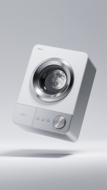 俯视角构图,一台棱角分明的哑光白滚筒洗衣机静置于深邃的午夜蓝渐变背景中,舱门以45度角优雅敞开,露出内部如精密齿轮般交错的银色不锈钢内筒,波浪形洗衣槽在侧逆光下形成明暗交错的几何阴影。顶部控制面板采用悬浮式设计,圆形旋钮泛着冷调金属光泽,LED显示屏正投射出幽蓝的数据光芒,按键排列如琴键般富有韵律感。洗衣机底部与光滑的液态银地面无缝相接,形成完美对称的倒影,地面反射着内筒的机械纹路与控制面板的点点蓝光。整体光线采用三点打光法:主光源勾勒出洗衣机锐利的轮廓线,辅助光凸显哑光与金属的材质对比,背光在背景墙投射出微妙的光晕渐变,营造出未来实验室般的科技静谧感,高清晰度捕捉每一处接缝的精密工艺。