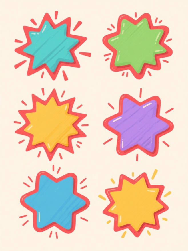 六个不同配色、不同样式、不同材质的爆炸贴造型,浅色背景,上下两行对齐排列,每个爆炸贴都有不规则的星形轮廓,边缘有红色描边,内部填充不同颜色,周围有红色的线条装饰,整体风格为卡通手绘风格,色彩鲜艳明快,视觉层级清晰,信息传达效率高。