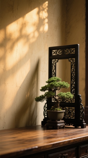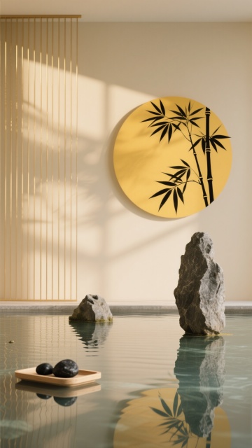 画面中央为圆形白色大理石展台,台面光滑有自然纹理,展台后方是新中式风格的浅米色磨砂质感墙面,墙面左侧有几缕柔和的斜射阳光形成光影层次。展台右侧摆放着一块形态自然的浅灰色岩石,岩石旁有一株枝干苍劲的青松,松针翠绿茂密,整体画面色调以米色、浅灰、墨绿为主,营造出宁静雅致的新中式氛围,光线柔和,阴影过渡自然,空间感通透,具有简约禅意的设计感。